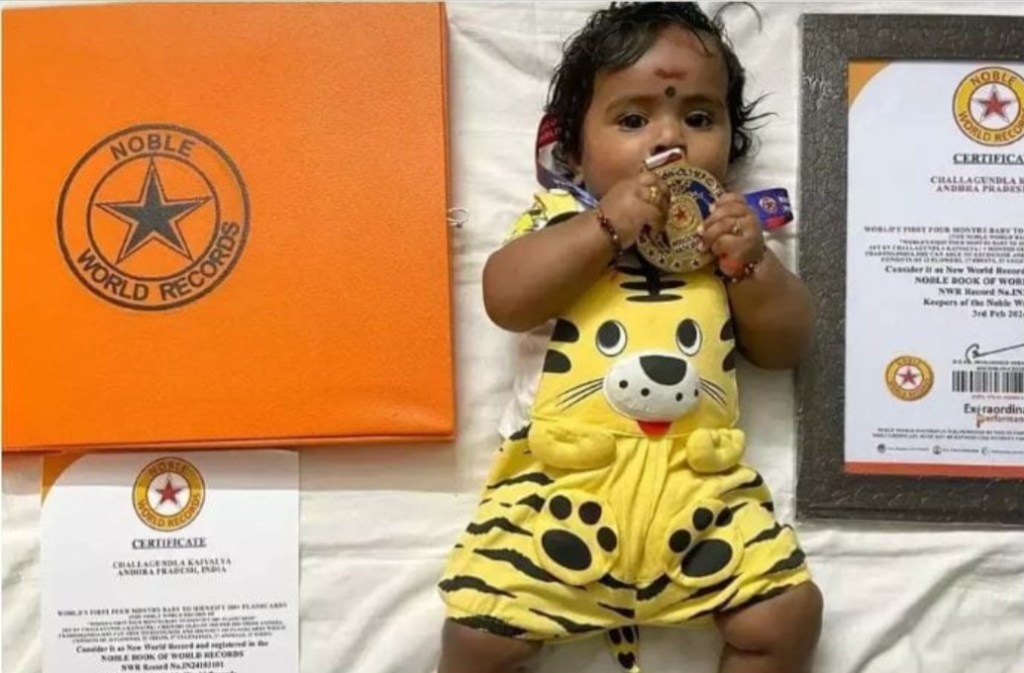 It shows a photo of an Indian toddler named Kaivalya from Nadigama town in Andhra Pradesh, who has captured global attention for her ability to identify an astonishing array of 120 different objects, ranging from birds and vegetables to animals and even photographs whose abilities have been registered as a world record in Noble World Records.