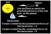 Since this distance is zero — obviously, not only the torque created by the gravitational force at the barycenter is zero; the torque exerted by the centrifugal force (acting on the planet) at the barycenter is also zero which implies that they don’t exert any torques at their barycenter.